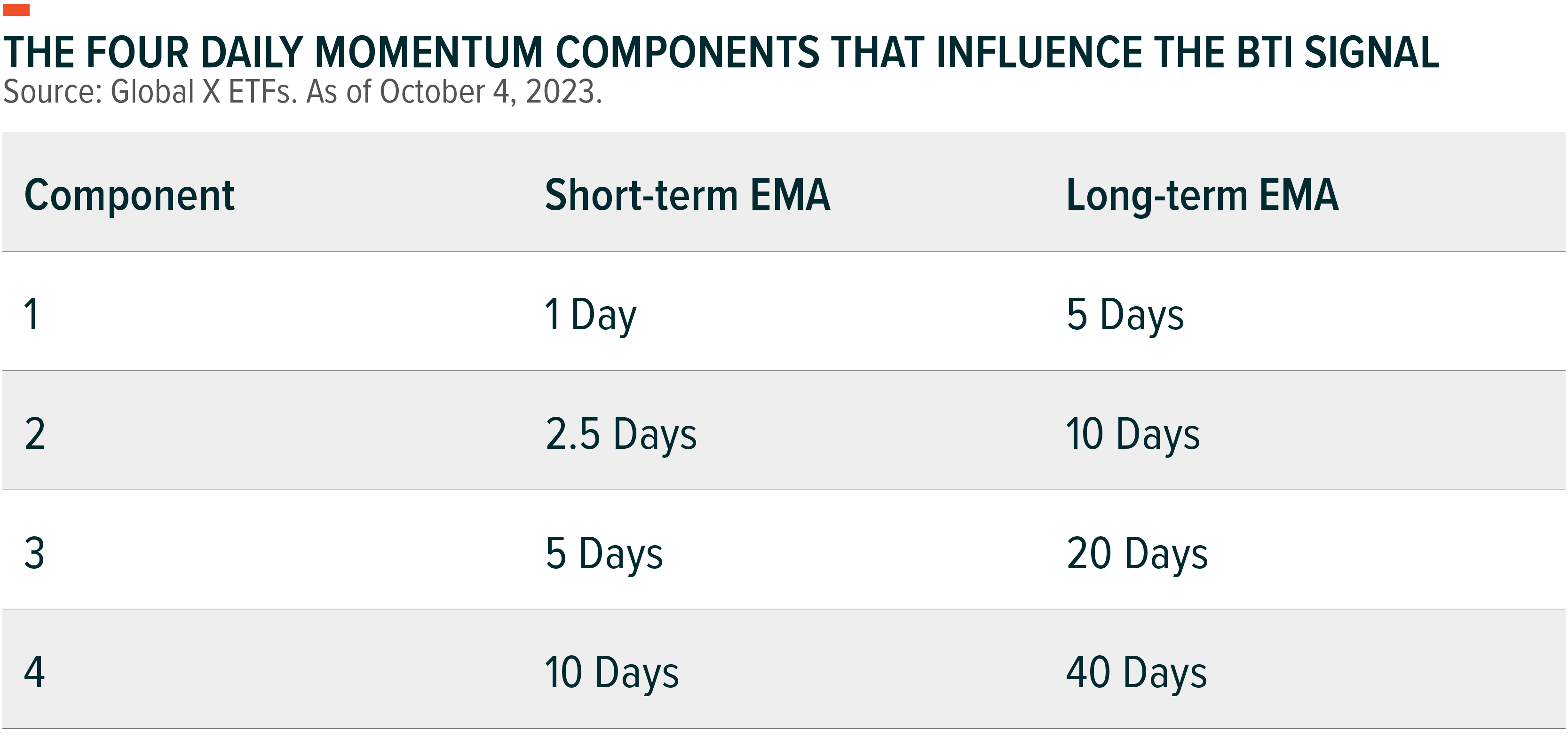 The BTI’s signal is the average of four components, each of which consists of a pair of exponential moving average (EMA) pairs of bitcoin’s price: one short-term and one long-term moving average. Every day, the EMA pairs of each BTI component are compared, yielding a result of either 1 or -1. When the component’s short-term EMA is greater than or equal to its long-term EMA, the component’s value is equal to 1, indicating an uptrend. Conversely, when the short-term EMA is less than the corresponding long-term EMA, the component’s value is equal to -1, indicating a downtrend. Upon deriving the values for each of the four components, the BTI calculates the average of these four values to produce the daily signal, which ranges from -1 to 1 in half point increments.