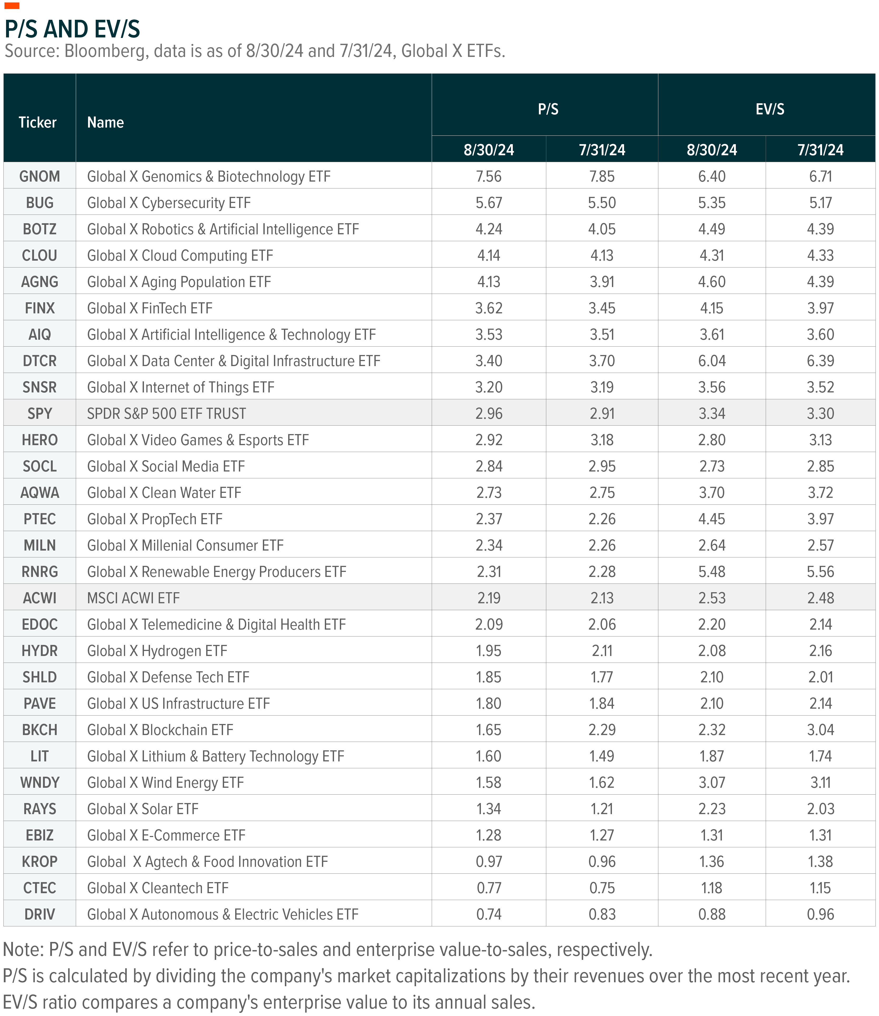 The following charts examine returns and sales growth expectations by theme, based on their corresponding ETFs or indices.